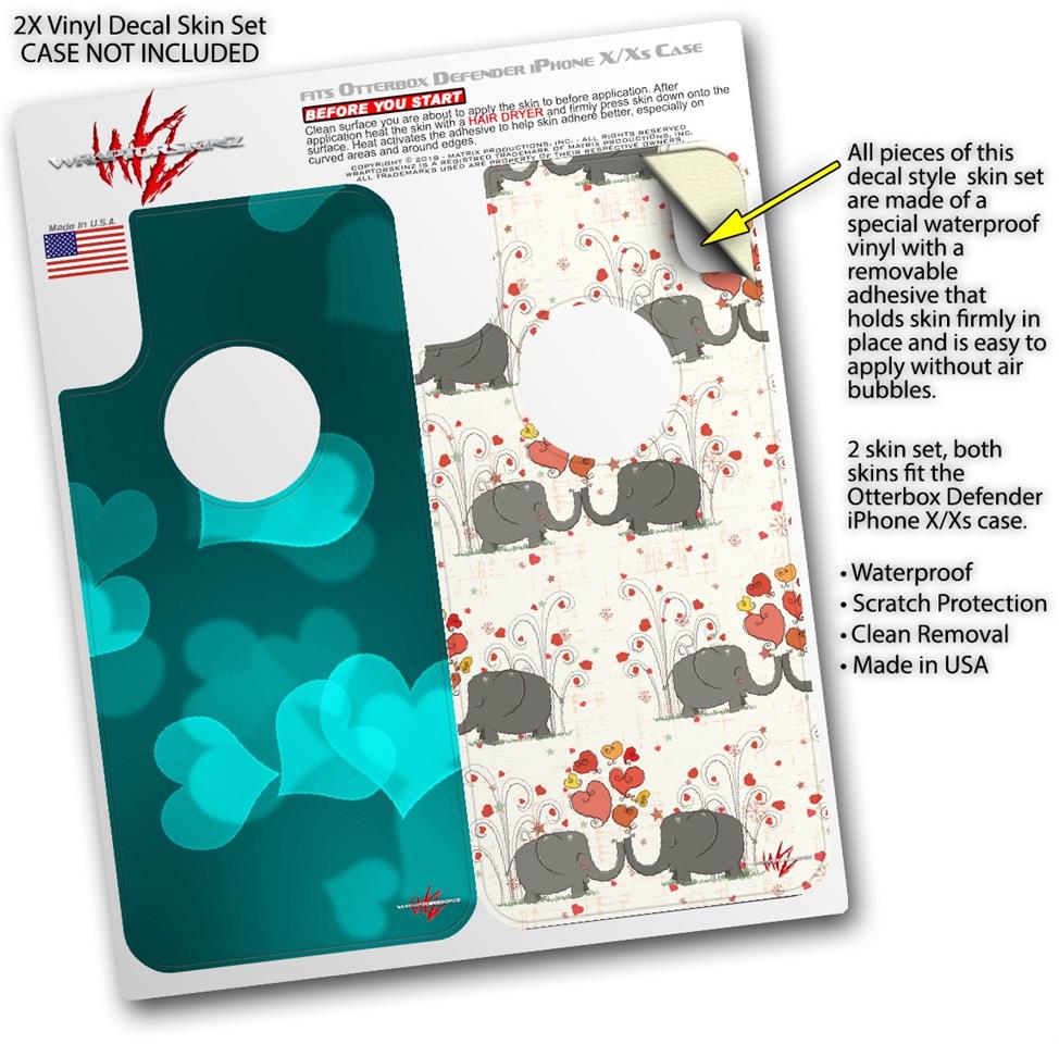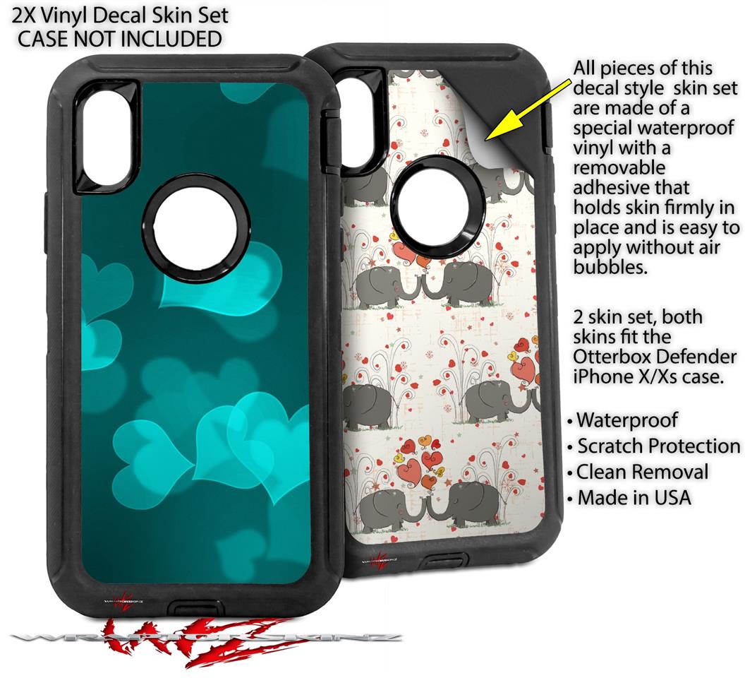2x Decal style Skin Wrap Set compatible with Otterbox Defender iPhone X and Xs Case - Bokeh Hearts Neon Teal (CASE NOT INCLUDED)